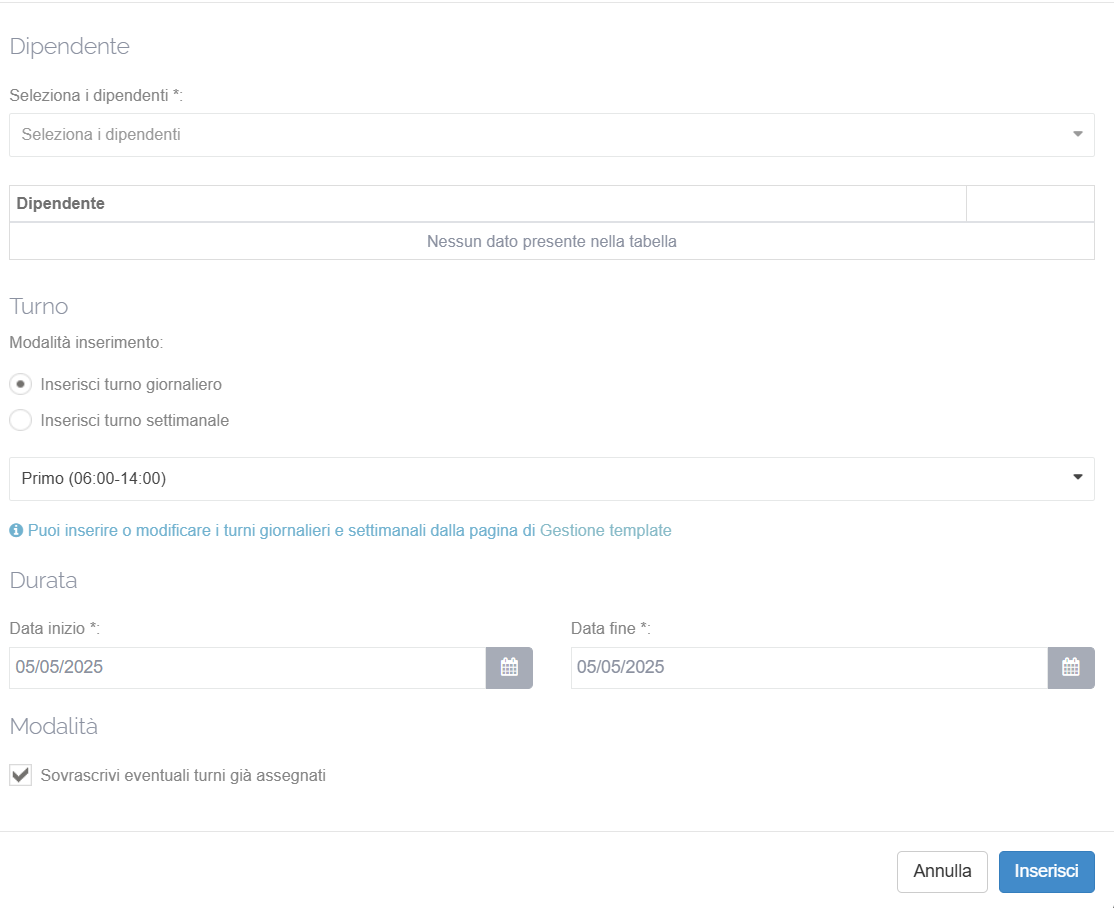 - Seleziona i dipendenti ai quali assegnare il turno
